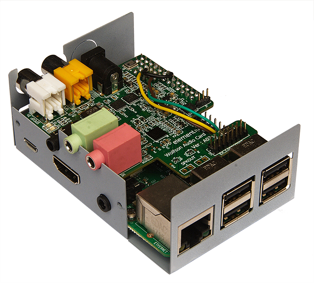 SPDIF In, SPDIF Out, Power (audio card), LAN, USB, A/V, HDMI, Power (Pi)